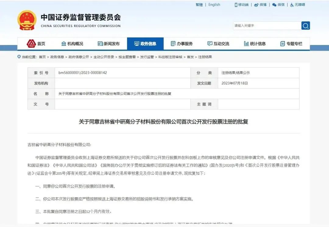 近日,證監(jiān)會網(wǎng)站發(fā)布關(guān)于同意吉林省中研高分子材料股份有限公司(以下稱“中研股份”)首次公開發(fā)行股票注冊的批復(fù),批復(fù)自同意注冊之日起12個(gè)月內(nèi)有效。