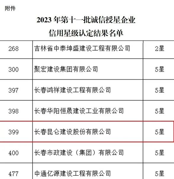 近日,中國(guó)施工企業(yè)管理協(xié)會(huì)公布2023年第十一批工程建設(shè)企業(yè)信用星級(jí)認(rèn)定結(jié)果,我司已投企業(yè)長(zhǎng)春昆侖建設(shè)股份有限公司(以下稱“昆侖建設(shè)”)被認(rèn)定為“2023年工程建設(shè)企業(yè)信用5星企業(yè)”。