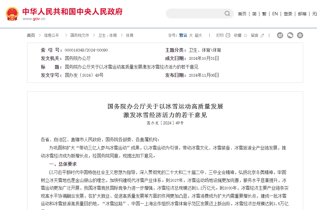國務(wù)院辦公廳日前印發(fā)《關(guān)于以冰雪運(yùn)動(dòng)高質(zhì)量發(fā)展激發(fā)冰雪經(jīng)濟(jì)活力的若干意見》(以下簡(jiǎn)稱《意見》)。
