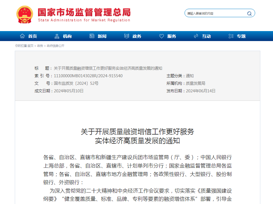 國家市場監(jiān)管總局會同中國人民銀行、金融監(jiān)管總局聯(lián)合印發(fā)《關(guān)于開展質(zhì)量融資增信工作更好服務(wù)實(shí)體經(jīng)濟(jì)高質(zhì)量發(fā)展的通知》,進(jìn)一步增強(qiáng)質(zhì)量政策與金融政策協(xié)同,助力實(shí)體經(jīng)濟(jì)發(fā)展。