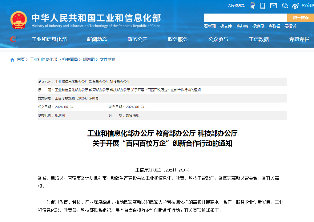 工業(yè)和信息化部、教育部、科技部等三部門聯(lián)合印發(fā)通知,組織開展“百園百校萬企”創(chuàng)新合作行動(以下稱“行動”)。行動實(shí)施周期為2024年6月—2025年6月,將促進(jìn)國家高新區(qū)、高校和企業(yè)優(yōu)勢互補(bǔ)、資源共享,圍繞成果轉(zhuǎn)化、技術(shù)攻關(guān)和人才培養(yǎng)開展深度合作,建立精準(zhǔn)對接渠道,構(gòu)建長效合作機(jī)制,落地一批科技創(chuàng)新成果,突破一批關(guān)鍵技術(shù)難題,輸送一批優(yōu)質(zhì)科技人才。