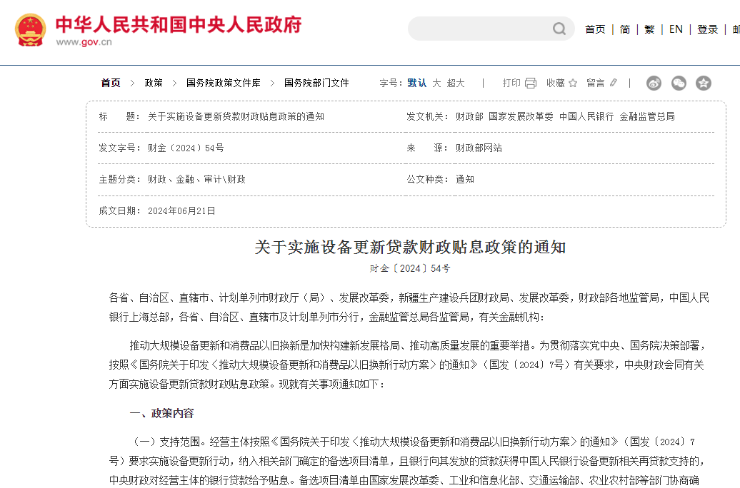 財政部、國家發(fā)展改革委、中國人民銀行、金融監(jiān)管總局聯(lián)合印發(fā)《關(guān)于實(shí)施設(shè)備更新貸款財政貼息政策的通知》。